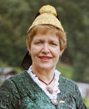 Haube: Die Goldhaube ist eine Kärntner Knopfhaube, voll bestickt und mit schwarzer Masche versehen.