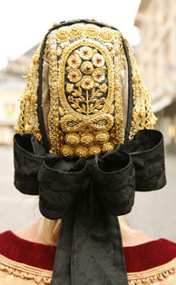 Echter Gold- oder Perlenschmuck wird individuell gewählt. Dieser kann ein edles Kropfband, eine Goldkette, eine Brosche oder Ohrgehänge sein. Haube: Es wird eine Bodenhaube mit schwarzem Untergrund und goldener Klöppelspitze mit goldbesticktem Spiegel getragen. Die Haube hat eine schwarze Masche mit Bändern, die bis in den Rücken reichen.